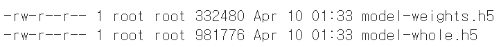 두가지 실험을 해보자. 첫 번째는 훈련을 하지 않은 새로운 모델을 만들고 model-weights.h5 파일에서 훈련된 모델 파라미터를 읽어서 사용한다. 두 번쨰는 아예 model-whole.h5 파일에서 새로운 모델을 만들어 바로 사용한다.