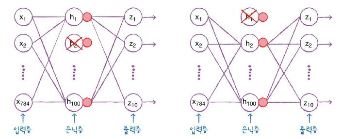 드롭아웃(dropout)은 다음 그림처럼 훈련 과정에서 층에 있는 일부 뉴런을 랜덤하게 꺼서(즉 뉴런의 출력을 0으로 만들어) 과대적합을 막는다.