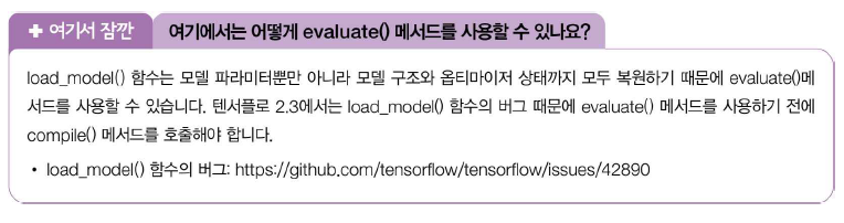 model.save_weights('model-weights.h5')또한 모델 구조와 파라미터를 함께 저장하는 save() 메서드도 제공한다. 기본적으로 이 메서드는 텐서플로의 SavedModel 포맷으로 저장하지만 파일의 확장자가 '.h5'일 경우 HDF5포맷으로 저장한다.