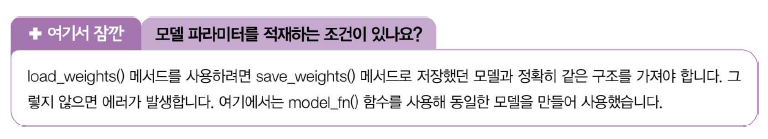 케라스 모델은 훈련된 모델의 파라미터를 저장하는 간편한 save_weights() 메서드를 제공한다. 기본적으로 이 메서드는 텐서플로의 체크포인트 포맷으로 저장하지만 파일의 확장자가 '.h5'일 경우 HDF5 포맷으로 저장한다.