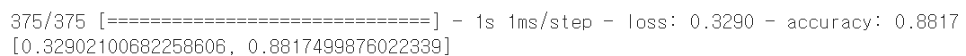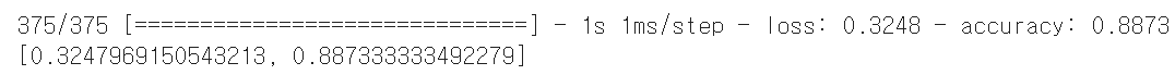 이번에는 모델 전체를 파일에서 읽은 다음 검증 세트의 정확도를 출력해 보겠다. 모델이 저장된 파일을 읽을 때는 케라스가 제공하는 load_mode() 함수를 사용한다.
