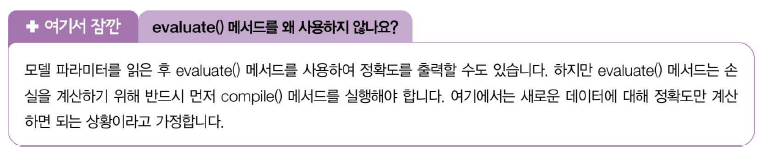 model.fit(train_scaled,train_target,epochs=20,validation_data=(val_scaled,val_target),callbacks=[checkpoint_cb])모델이 훈련한 후에 best-model.h5에 최상의 검증 점수를 낸 모델이 저장된다. 이 모델을 load_model() 함수로 다시 읽어서 예측을 수행해본다.
