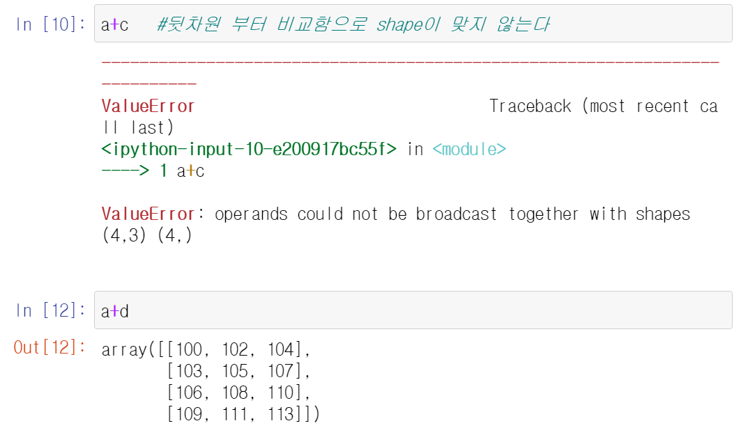 - ex) (4,3) + (1,3) 이면 (1,3)의 3이 (4,3)의 3과 같으므로 broadcasting 가능하다 그러나 (4,3) 과 (1,4)는 뒤 행렬의 4와 앞 행렬의 3이 다름으로 broadcasting이 불가능 하다