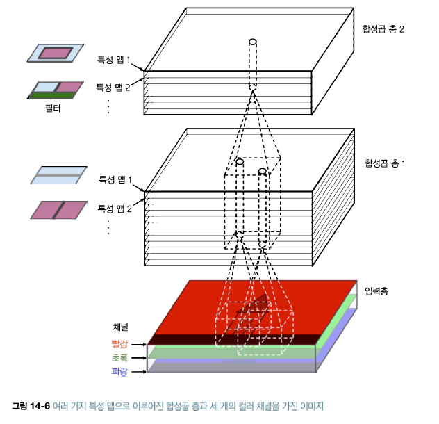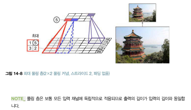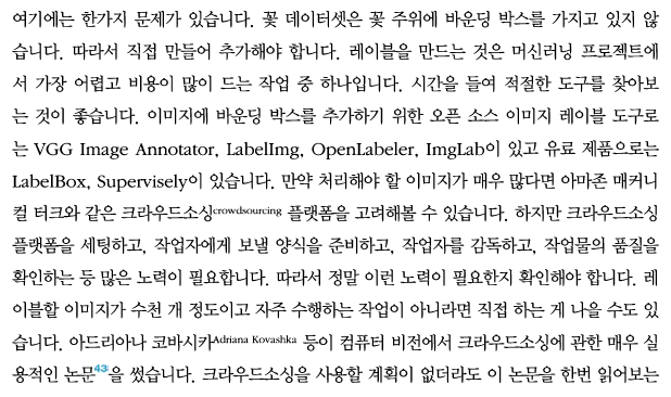 하나의 이미지에서 여러 물체를 분류하고 위치를 추정하는 작업을 객체 탐지(object dection)이라고 한다. 몇 년 전까지 널리 사용되던 방법은 하나의 물체를 분류하고 위치를 찾는 분류기를 훈련한 다음 그림 14-24처럼 이미지를 모두 훑는 것이다. 이 예에서는 이미지를 6x8 격자로 나누고 하나의 CNN(굵은 검정 사각형)이 모든 3x3 영역을 지나간다. 이 CNN이 이미지 왼쪽 상단을 지나갈 때 가장 왼쪽에 있는 장미꽃의 일부를 감지한다. 그다음 오른쪽으로 한 스텝 이동해서 같은 꽃을 다시 감지한다. 그다음 스텝에서 가장 위쪽에 있는 장미꽃을 감지하기 시작한다. 다시 오른쪽으로 한 스텝 이동해서 같은 꽃을 감지한다. 이런 식으로 CNN이 전체 이미지를 슬라이딩하면서 모든 3x3 영역을 본다. 또..