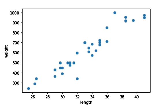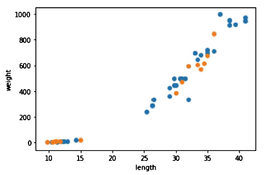 이 포스팅은 혼자 공부하는 머신러닝 + 딥러닝 책을 공부하고 정리한 것 입니다. 훈련 세트와 테스트 세트 시험에서 연습 문제와 시험 문제가 달라야 올바르게 학생의 능력을 평가할 수 있듯이 머신러닝 알고리즘의 성능을 제대로 평가하려면 훈련 데이터와 평가에 사용할 데이터가 각각 달라야 한다. 이렇게 하는 가장 간단한 방법은 평가를 위해 또 다른 데이터를 준비하거나 이미 준비된 데이터 중에서 일부를 뗴어 내어 활용하는 것이다. 일반적으로 후자의 경우가 많다. 평가에 사용하는 데이터를 테스트 세트(test set), 훈련에 사용되는 데이터를 훈련세트(train set) 라고 한다. 먼저 도미와 빙어의 데이터를 합쳐 하나의 파이썬 리스트로 준비한다. fish_length = [25.4, 26.3, 26.5, 29..