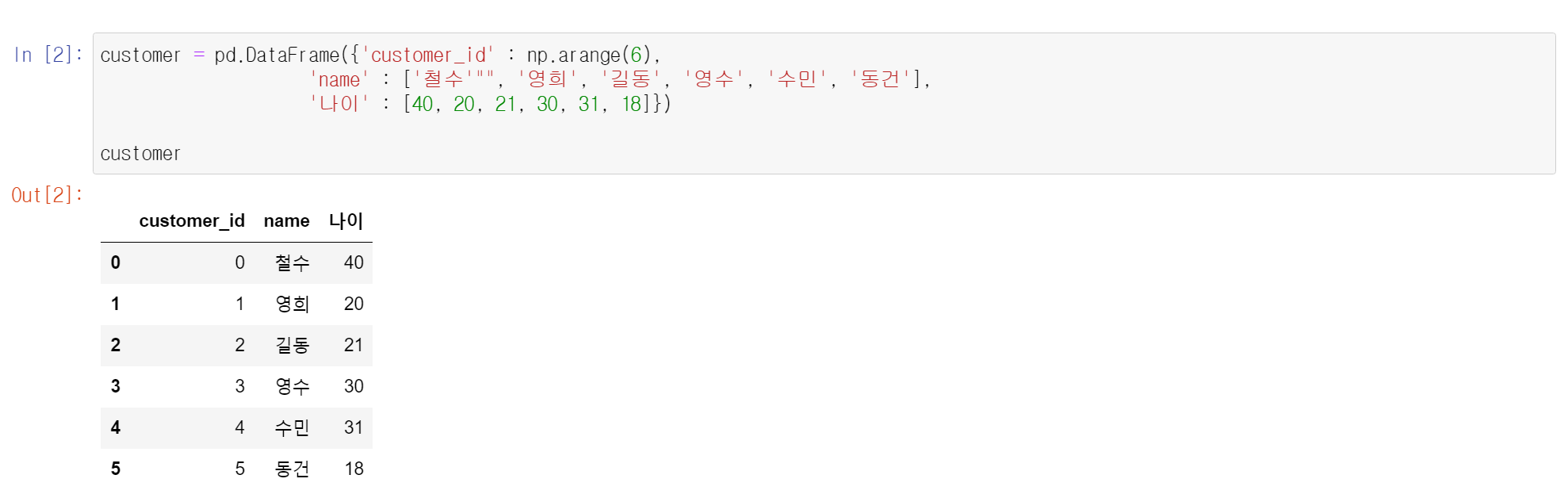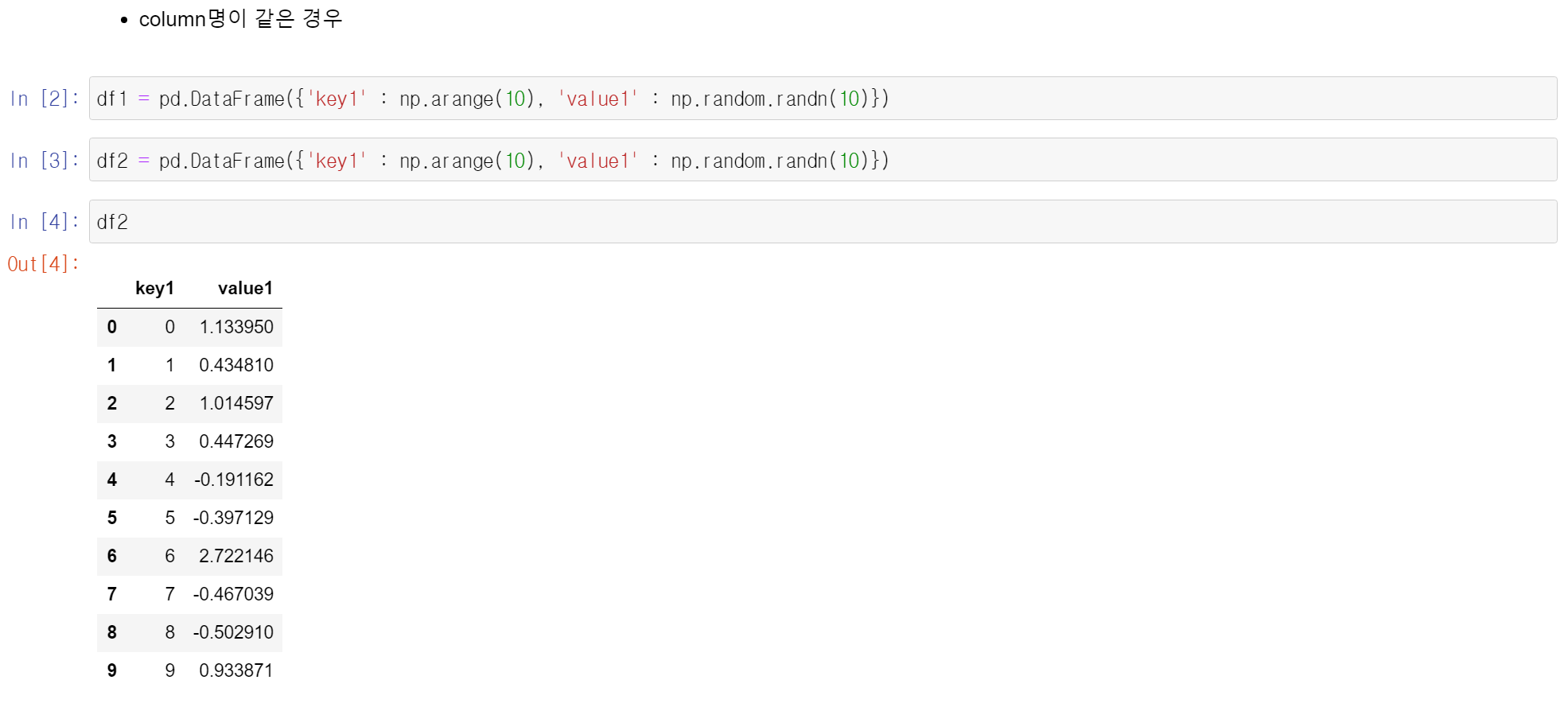 import numpy as np import pandas as pd dataframe merge SQL의 join처럼 특정한 column을 기준으로 병합 join 방식: how 파라미터를 통해 명시 inner: 기본값, 일치하는 값이 있는 경우 left: left outer join right: right outer join outer: full outer join pandas.merge 함수가 사용됨 on join 대상이 되는 column 명시 index 기준으로 join 하기